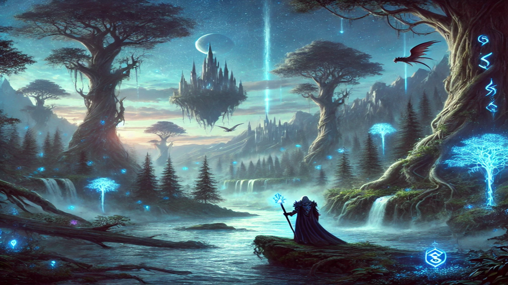 This artworkis for personal use only, titled "Ethereal Odyssey: The Guardian's Watch," size 3000x3000px immerses viewers in a breathtaking fantasy realm. The scene unfolds in a mystical forest at twilight, where towering, ancient trees glow softly with an ethereal blue light, their trunks adorned with faint magical runes. A shimmering river of pure energy winds through the heart of the forest, reflecting the enchanting hues of the surroundings.